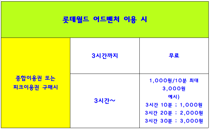 ✅ 롯데월드 어드벤처(종합이용권/파크이용권)와 파크 내 · 외 기프트샵/레스토랑 이용 시 무료주차시간 합산가능합니다. 단, 당일 이용 영수증에만 적용됩니다.